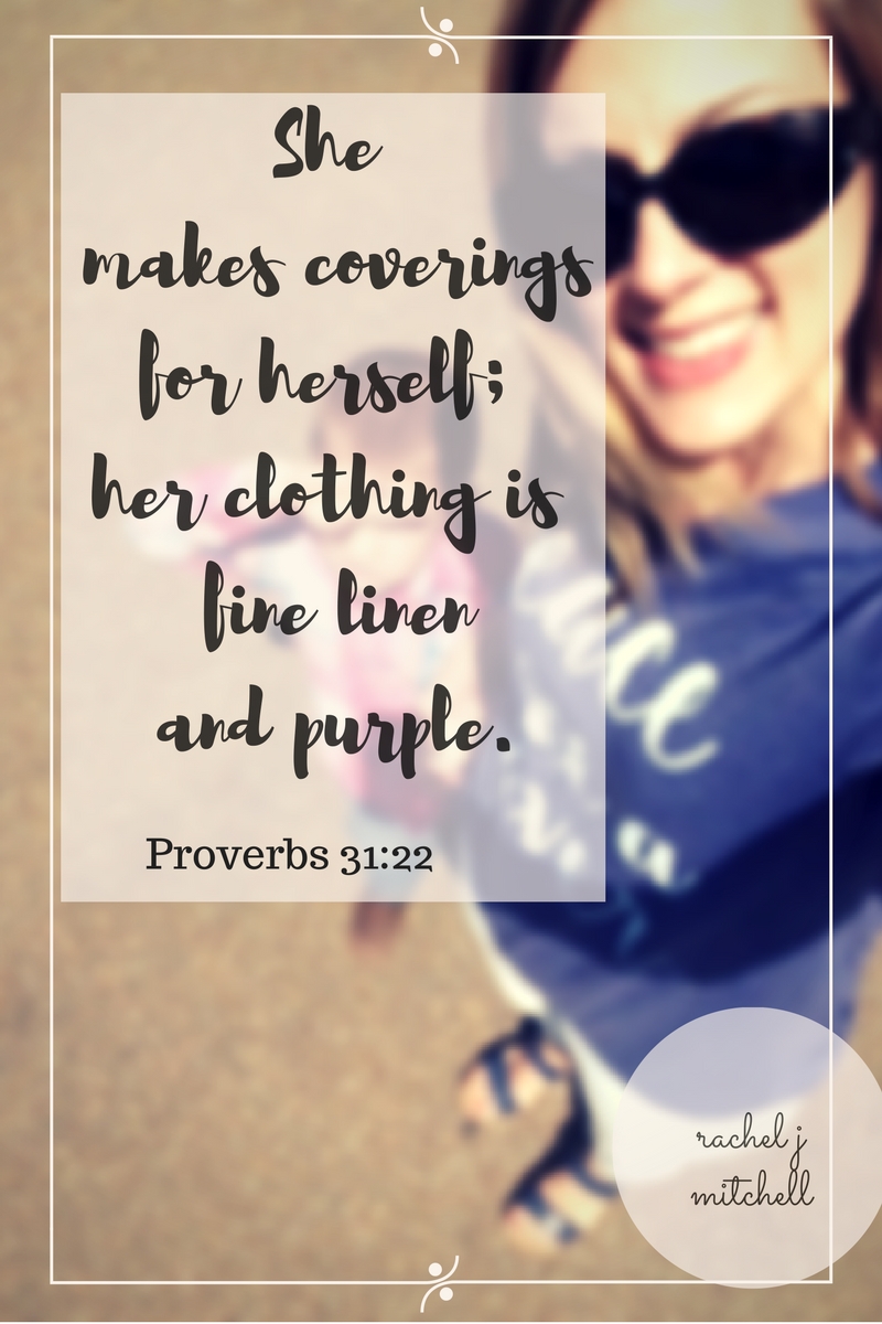 This Proverbs 31 woman that we all study so intensely wasn’t perfect either, but this verse clearly tells us that she took time to clothe herself. And not just any old clothes, but in fine linen and purple (which denotes royalty).